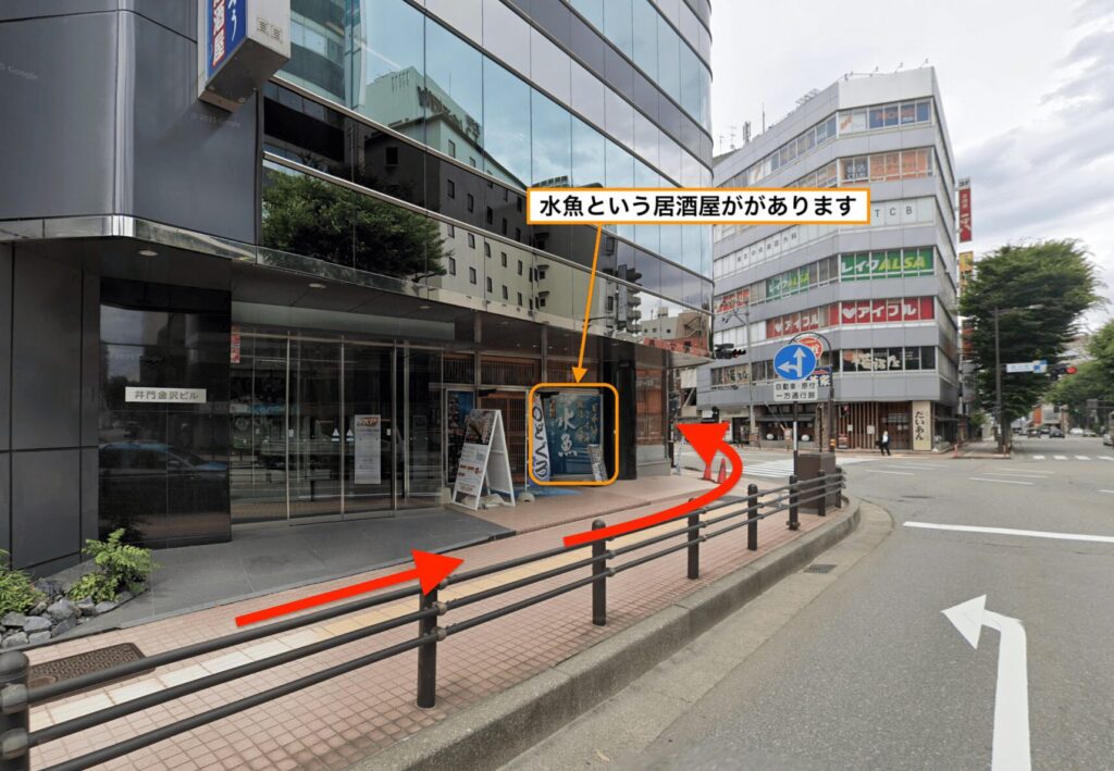 - 道順5途中「水魚」という居酒屋を超えて左折します