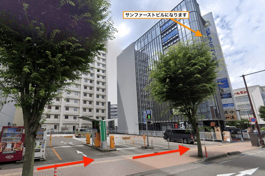 - 道順6進んだ先の駐車場の隣に「サンファーストビル」があります。