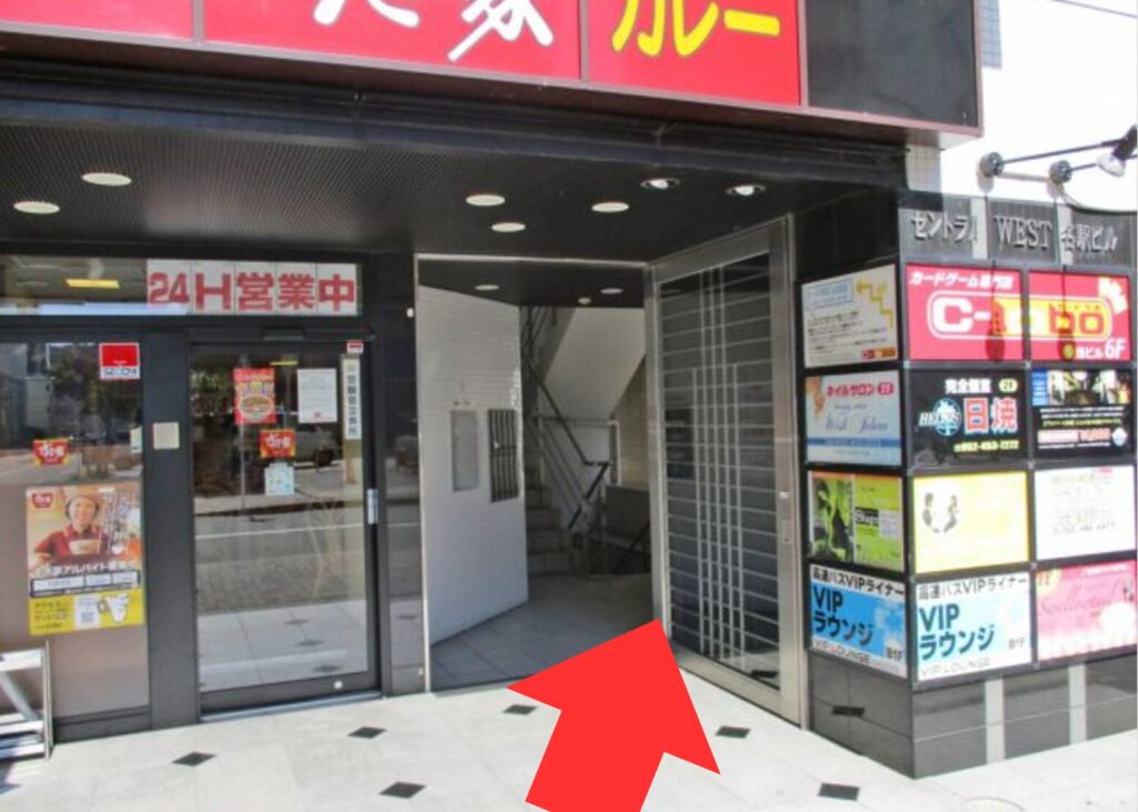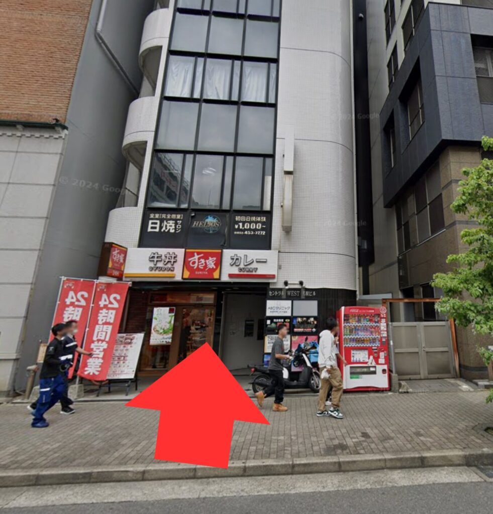 ABCクリニック名古屋院はJR名古屋駅の太閤口を抜け、ビックカメラ前の通りを左折、ミニミニがある交差点を右折します。すき家があるビルの9階にクリニックがあります。