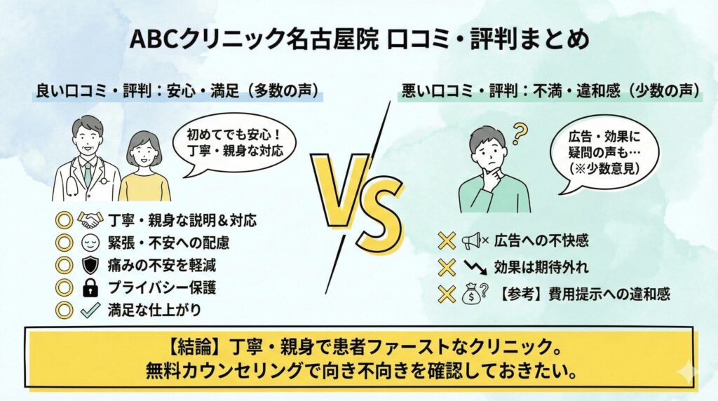 以下ではABCクリニック名古屋院の良い口コミ・評判と悪い口コミ・評判の詳細を見ていき、編集部の見解をお伝えしていきます。