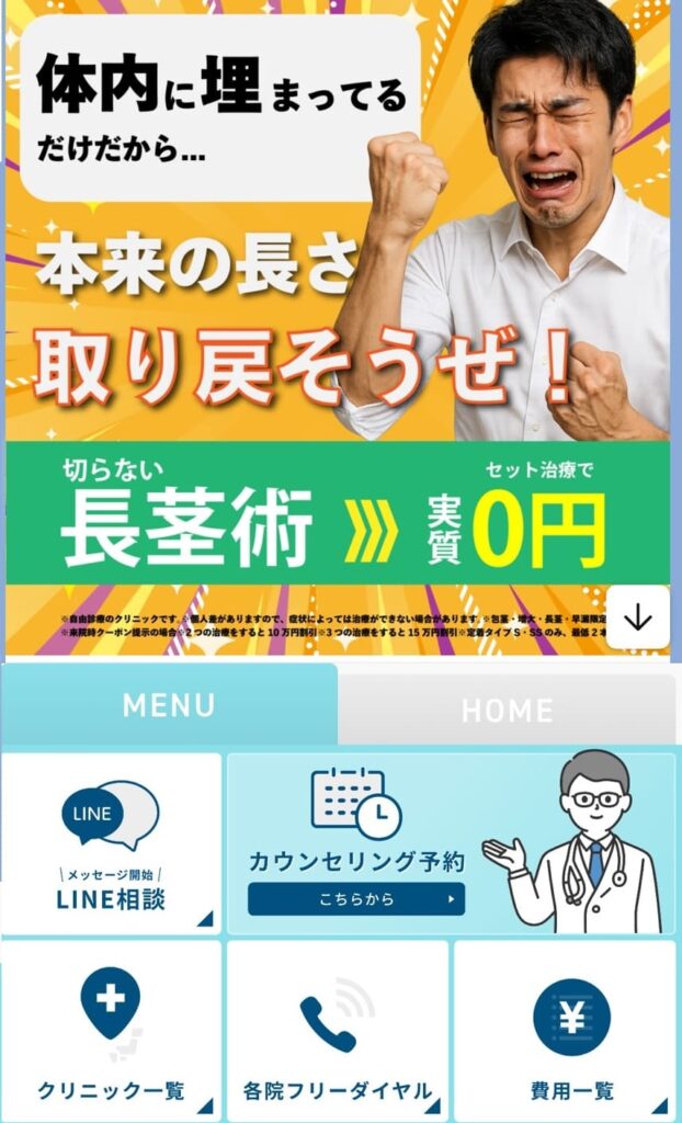 例えば「包茎手術+増大治療」で10万円OFF、「包茎手術+増大治療+長茎術」の実施で15万円OFFというクーポンになります。