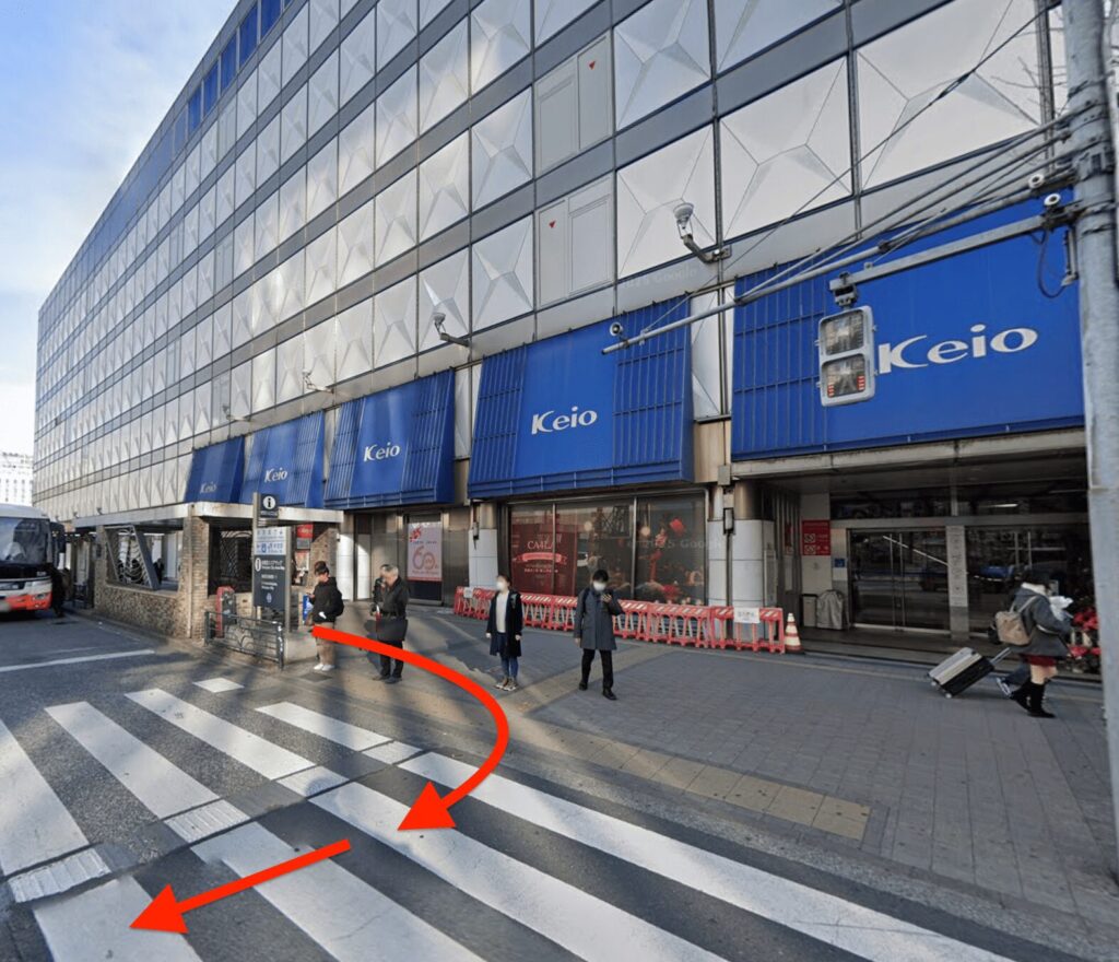 「西口 5番出口」出たら京王百貨店前の交差点を渡ります。