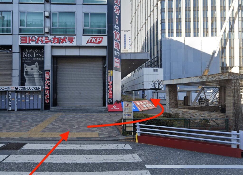 交差点を渡り、ヨドバシカメラ沿いの「プラザ通り」へ向かいます