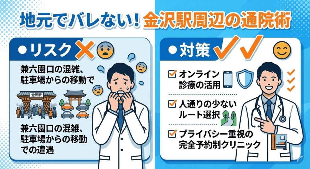 金沢市内でED治療を検討する際、真っ先に候補に上がるのが金沢駅周辺のクリニックです。しかし、地元の方にとって最大のネックは「誰かに見られないか?」というプライバシーと「通いやすさ」についても気にしておきたいところです。