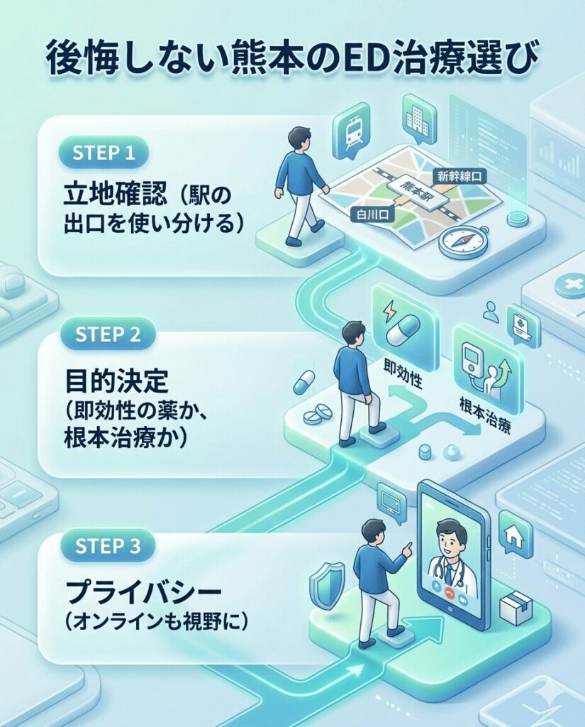 熊本駅周辺でED治療を検討する場合、「近い」という理由だけでクリニック選ぶと知人と顔をあわせる可能性にも繋がります。「知り合いに鉢合わせたくない」「市電で通うのは目立つ気がする」といった駅周辺での不安を解消するため、クリニックへのアクセス経路・治療スタイル・プライバシー確保の3軸から、安心してED治療ができる選び方をナビゲートします。