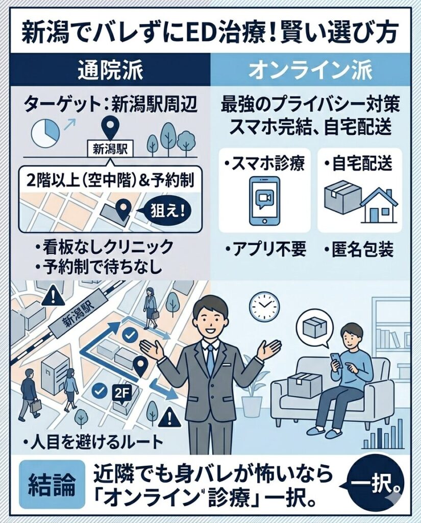 【結論】新潟周辺のED治療クリニックは目的別で選ぶのがおすすめ!コスパ重視ならオンライン診療も考慮