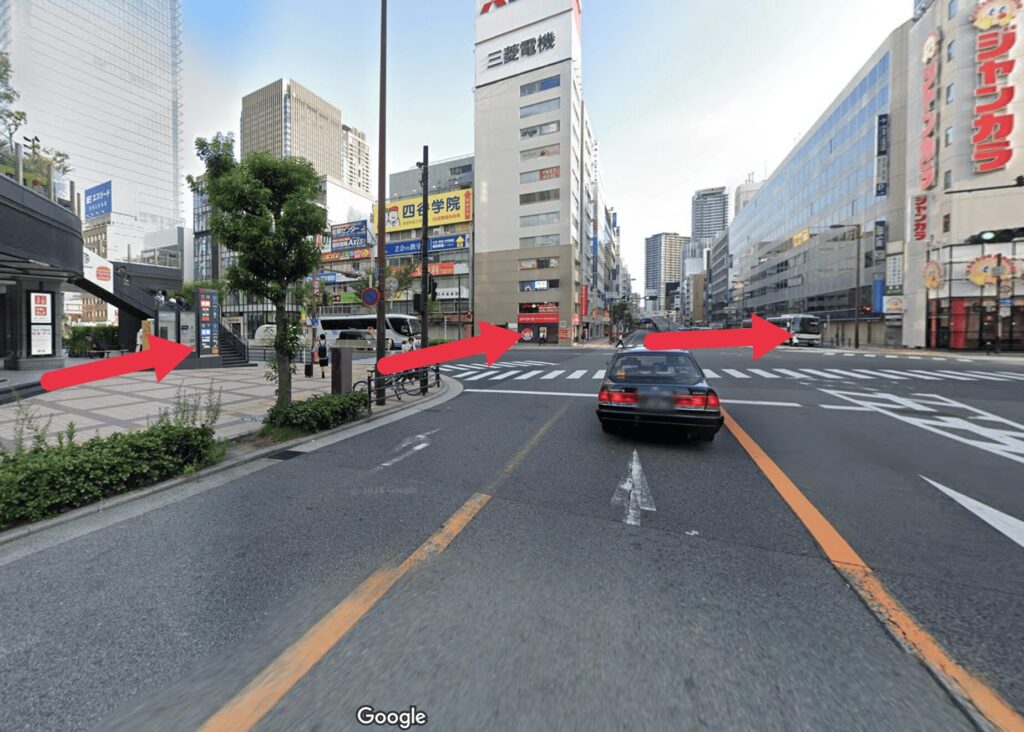 - 道順6地上に出たら右折し交差点を「ジャンカラ」側へ渡ります