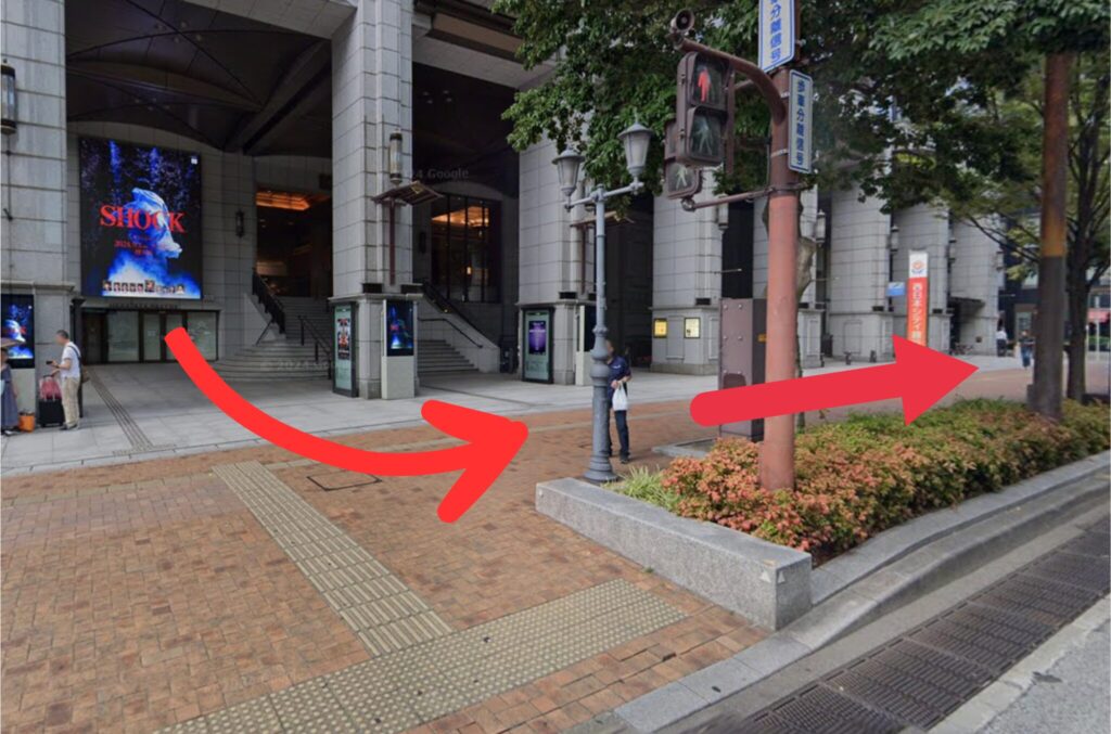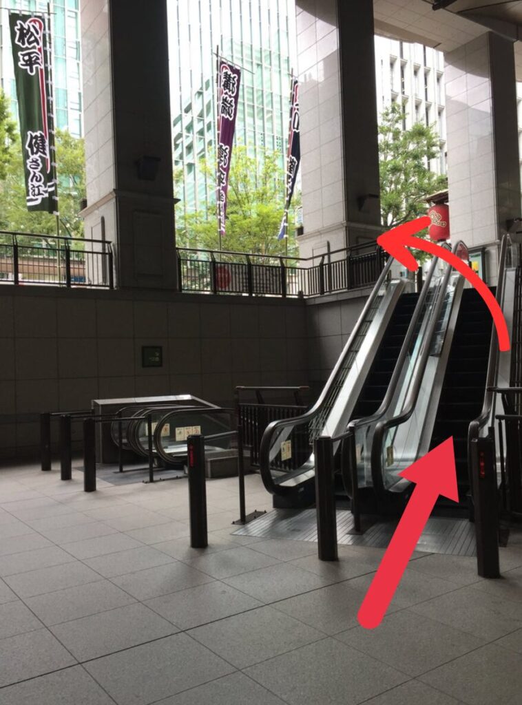 正面のエスカレーターを上がり地上へ向かい「博多座」を出て左折します。