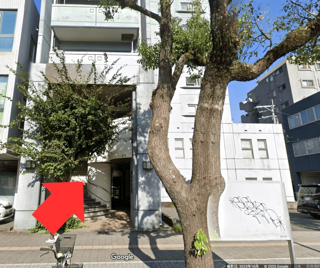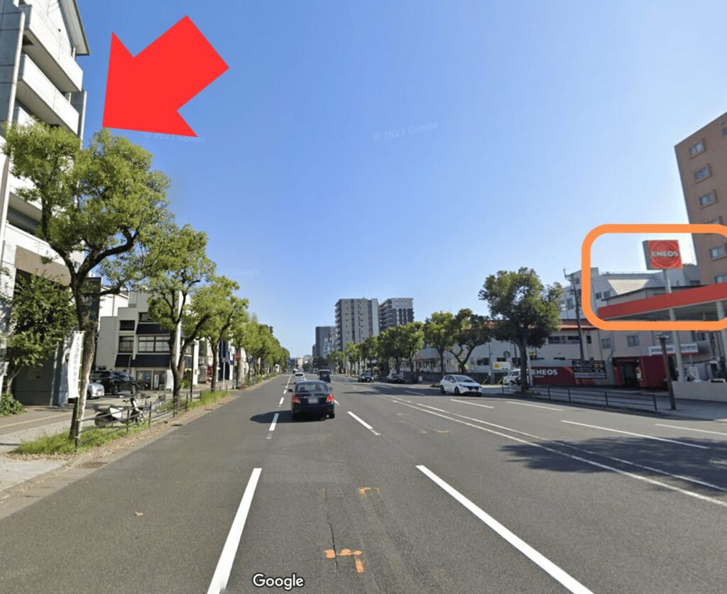 1つ目の交差点を越えると屋根が三角形状のシーフォート新町ビルがあり、303号室に鹿児島院を構えています。(反対側にはENEOSが見える位置です。)