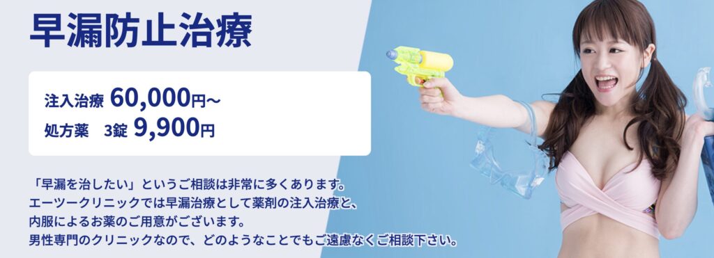 | 特徴 | 内服薬、薬剤注入など早漏治療に対する選択肢が豊富 | 内服薬、薬剤注入など早漏治療に対する選択肢が豊富 |
