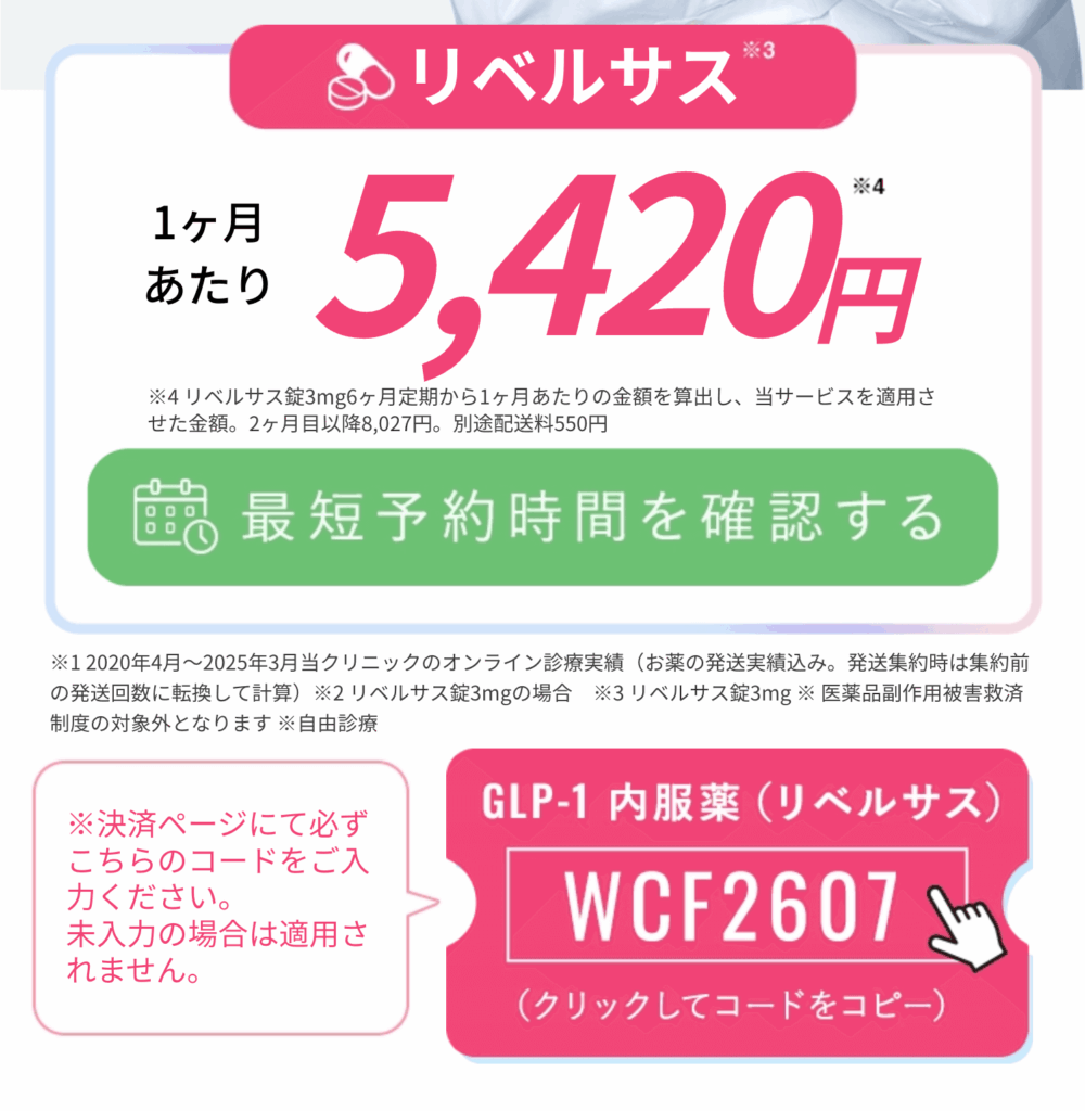 ※1:リベルサス錠3mg6ヶ月定期からひと月あたりの金額を算出し、決済時に決済画面で「WCF2607」を入力した場合の金額。2ヶ月目以降8,027円。クーポンは1ユーザーあたり1回のみ利用可能。お薬の処方がない場合は診察料1,650円がかかります。別途配送料550円〜1,100円。医学的必要性がないと医師が判断した方には薬剤の処方はできません。 医薬品副作用被害救済制度の対象外となります。自由診療。